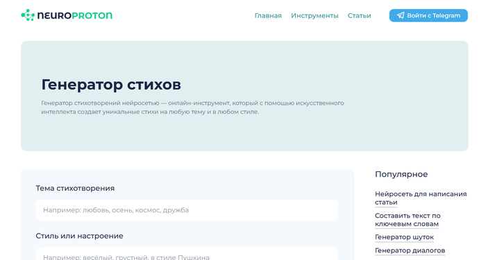 Искусственный интеллект для написания стихов на русском языке для быстрого сочинения рифмованных текстов: указываете тему и стиль/настроение, нажимаете «Сгенерировать», и результат появляется на странице. Черновик можно сразу «Скопировать» или «Сохранить как файл», что удобно для поздравлений, школьных заданий, песенных заготовок и мини-поэм. Сервис подчеркивает, что подбирает рифмы и «красиво все сложит», а сам генератор — часть экосистемы с десятками ИИ-инструментов (тексты, изображения, аудио), так что поэзию легко дополнять сопутствующим контентом на одном сайте. Вход возможен через Telegram, а раздел «Популярное» помогает быстро находить смежные инструменты.