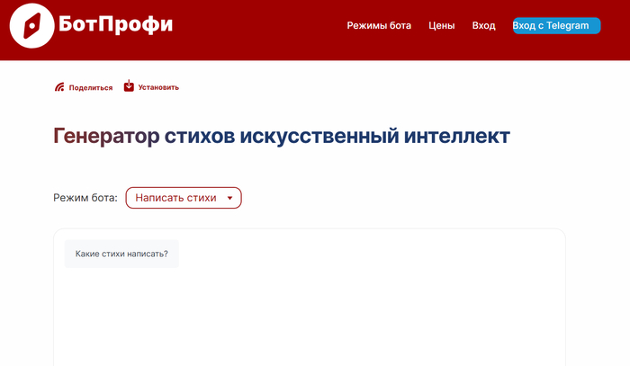 Возможности: генерация стихов по теме, выбор тона, генератор рифм, вход через Telegram/email, сохранение истории после входа