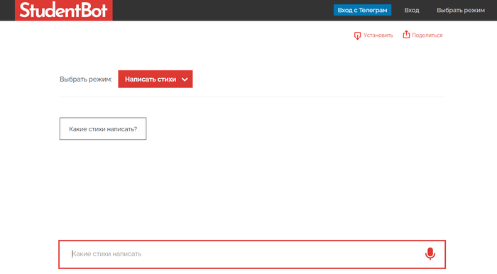 Возможности: генерация стихов по ключевым словам, подбор рифм, анализ стихотворений, генерация заголовков, рерайт, общение с ИИ на русском