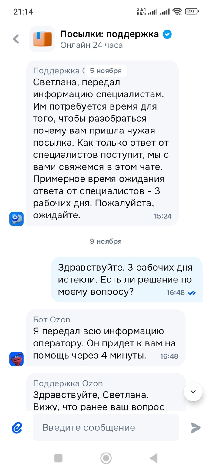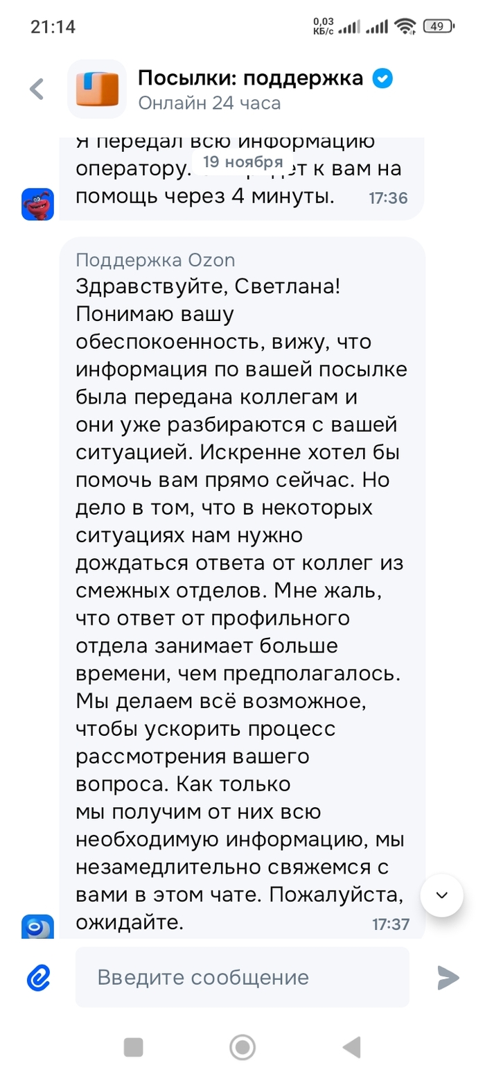 Отправили мне ботинки через озон, прихожу получать, разворачиваю и вижу милые елочные игрушки (эх, наверное, их тоже кто-то ждал) вместо ботинок. Номер посылки верный. Но видно, что даже коробка не та, которую отправитель приносил - он сфоткал и коробку, и вложение. Да и в пункте приема сотрудник сфоткал вложение. Короче, в моем пункте сотрудник поохала, что-то там "внесла в систему" , я получать это отказалась, ну и по их правилам посылка ушла назад в пункт, из которого пришла. Я в чате написала, мне сказали, ждите, примерно в течение 3 рабочих дней порешаем. Прошло уже больше 17 дней календарных, но воз и ныне там. Мне отвечают, что у них даже максимальных сроков рассмотрения нет. Ждите, и всё. Сегодня пришло уведомление, что завтра посылку утилизируют, как не полученную. Причем, у меня в приложении нигде и никак не видно, сто посылка пришла чужая. Просто посылка "ожидает в пункте получения". Фото сложения - мои ботинки. Нигде елоигрушки не фигурируют. По их договору не пришедшая в течение 30 дней посылка считается утерянной. Причем, по тх же правилам я должна в приложении в посылке нажать на кнопку"претензии " и отправить им ее. Но у меня в моей посылке такой кнопки нет, т.е. она же не утеряна - ну просто не моя пришла. Вот так веселенько...