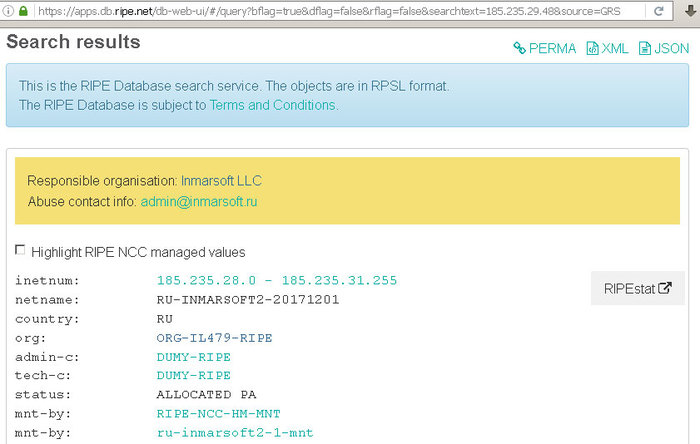Согласно данным Whois-сервиса RIPE NCC (организации, отвечающей за распределение IP-адресов в Европе), администратором блока IP-адресов 185.235.28.0-185.235.31.255, куда входит и IP-адрес 185.235.29.48, является организация Inmarsoft LLC с сайтом inmarsoft.ru (https://apps.db.ripe.net/db-web-ui/#/query?bflag=true&df...).