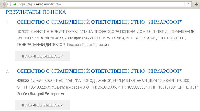 Некое Inmarsoft LLC, название которого нетрудно обратно трансфкрибировать на русский, а вот с организационно-правовой формой сложнее: это может быть и ООО, и ЗАО – некая компания с ограниченной ответственностью. Можем, конечно, поискать ее через ЮГРЮЛ и даже найти... два варианта: в Питере и в Ижевске (спойлер: нас интересует питерский вариант, тем более что ижевский уже ликвидирован):