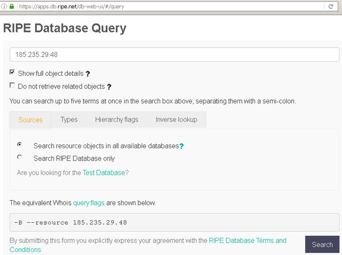 Чтобы выяснить это, лезем, например, в базу распределения блоков IP-адресов RIPE, расставляем галочки как на скрине, и жмем кнопку Search.