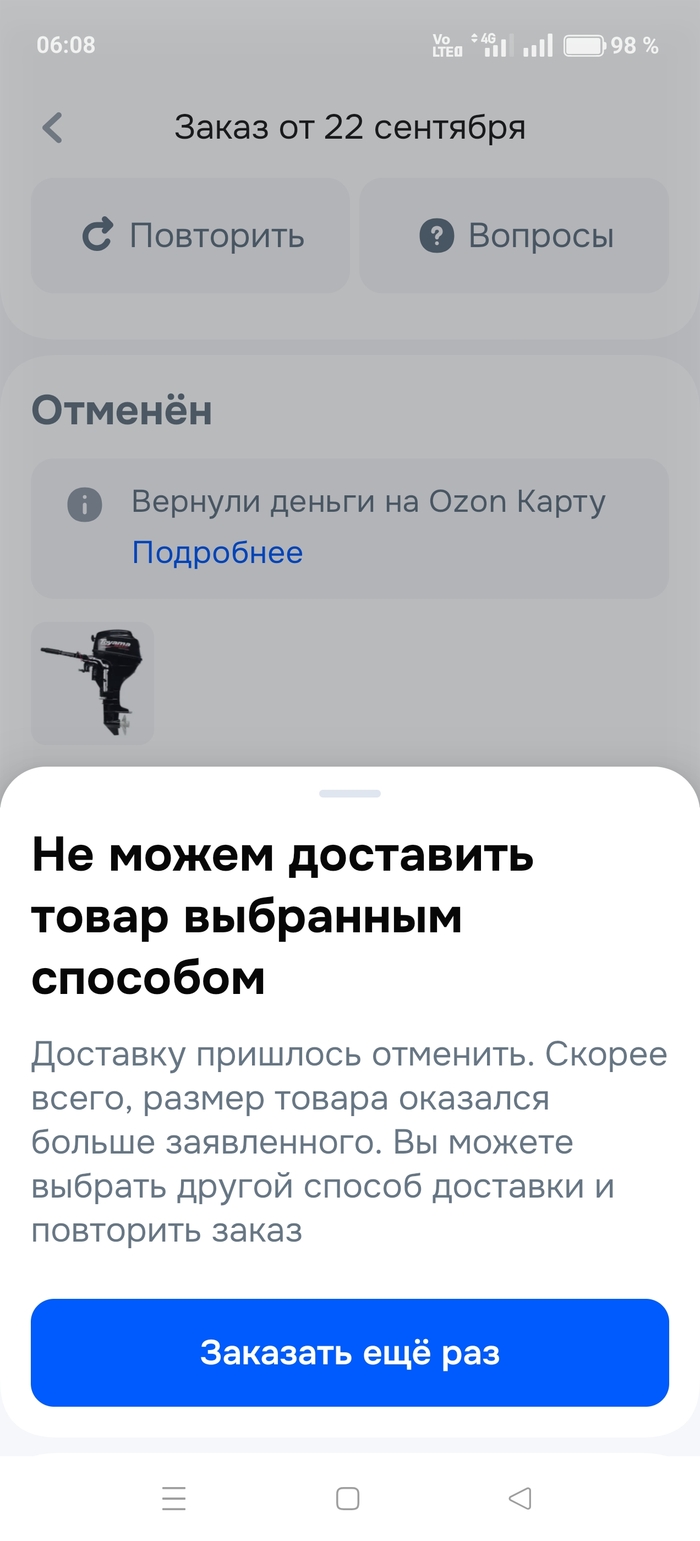 За примерно два дня до заявленной доставки, заказ отменяется, деньги возвращают на карту озона с формулировкой не можем доставить товар выбранным способом. Все бы ничего, и можно заказать по новой, но цена поднималась ещё два раза. И уже разница, с той что я оплатил, составляла больше 30000 руб.