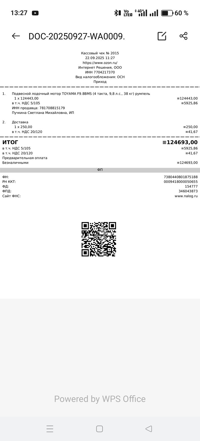 Заказал на озоне лодочный мотор по цене 124693 руб. Чек прилагаю. Цена была ниже чем у конкурентов. Но это не ошибка в цене. Данная цена висела несколько дней. После того как я сделал заказ и полностью оплатил товар, цена примерно через 30 минут поднялась сразу на 20000 руб.