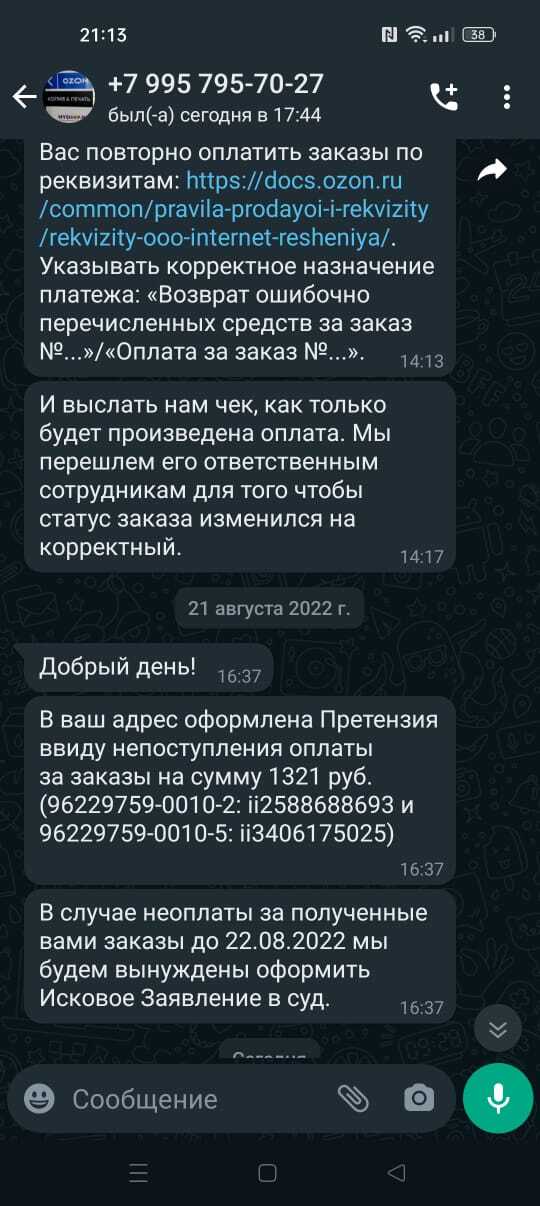 Короче. Парень заказал на озоне товар, расплатился баллами ВТБ, заказ пришёл, он его забрал. А сотрудник, видимо, забыл поменять статус. Он писал в поддержку озон, что всё забрал, в поддержке отвечали что всё окей. Но заказы отменились и баллы вернулись. Сотрудники пвз начали писать в ватсап просьбы оплатить деньгами. Да, может мы поступили не очень хорошо, проигнорировав это. Но ошибка была пвз, а не наша. В предыдущем посте я получила ответ от озона, "сможете оплатить-хорошо. Не сможете-вопрос закрыт". Этот ответ мы и скинули пвз.