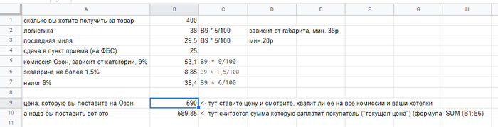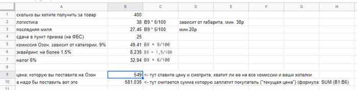 Ячейка 9, выделена рамочкой: тут ставьте цену, по которой вы будете продавать на Озоне. Именно с этой ячейкой будем «играться».