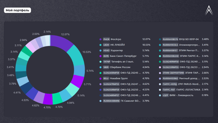 Сейчас мой портфель выглядит так: Сбер, Лукойл, Татнефть (префы), БСПб (обычка), ФосАгро, Хэдхантер, Новабев, а также ОФЗ, корпоративные фиксы и фонды недвижимости. Постепенно портфель формируется, и он изначально заточен под получение пассивного дохода.