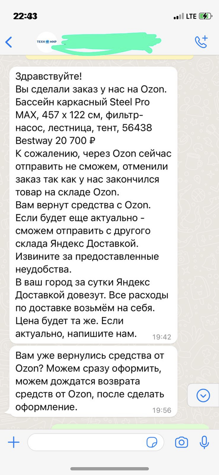 Вкратце: заказали каркасный бассейн на OZON, говорила мужу что как-то дёшево, но он меня уговорил, мол это же Озон. В день доставки мне пришло сообщение от Озона что заказ отменён - деньги вернём