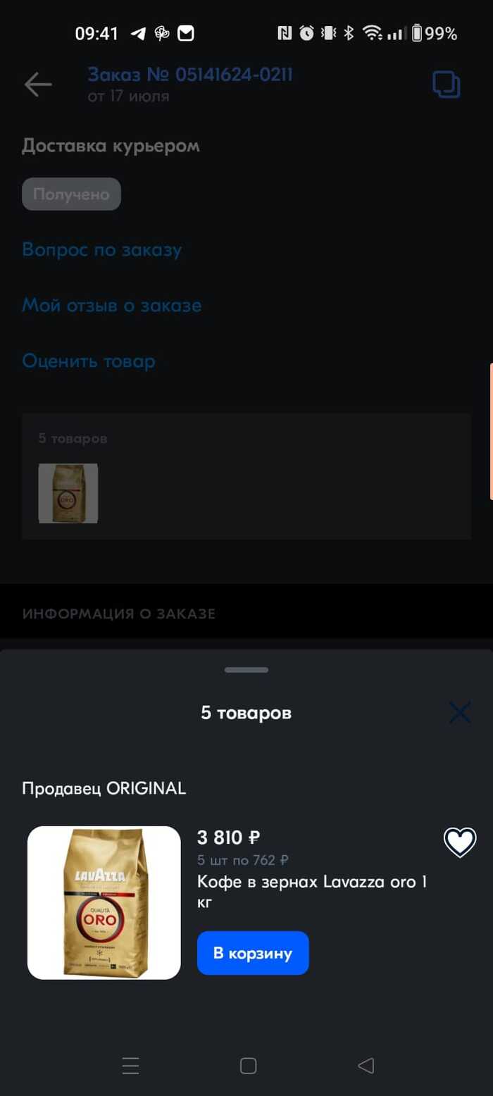 Сделали заказ 17.07.2023 на кофе 5 пакетов по 1 кг за 3810р (каждый пакет по 762р) с доставкой. Ничего скрывать не буду (кроме адреса и телефона): номер заказа 05141624-0211.