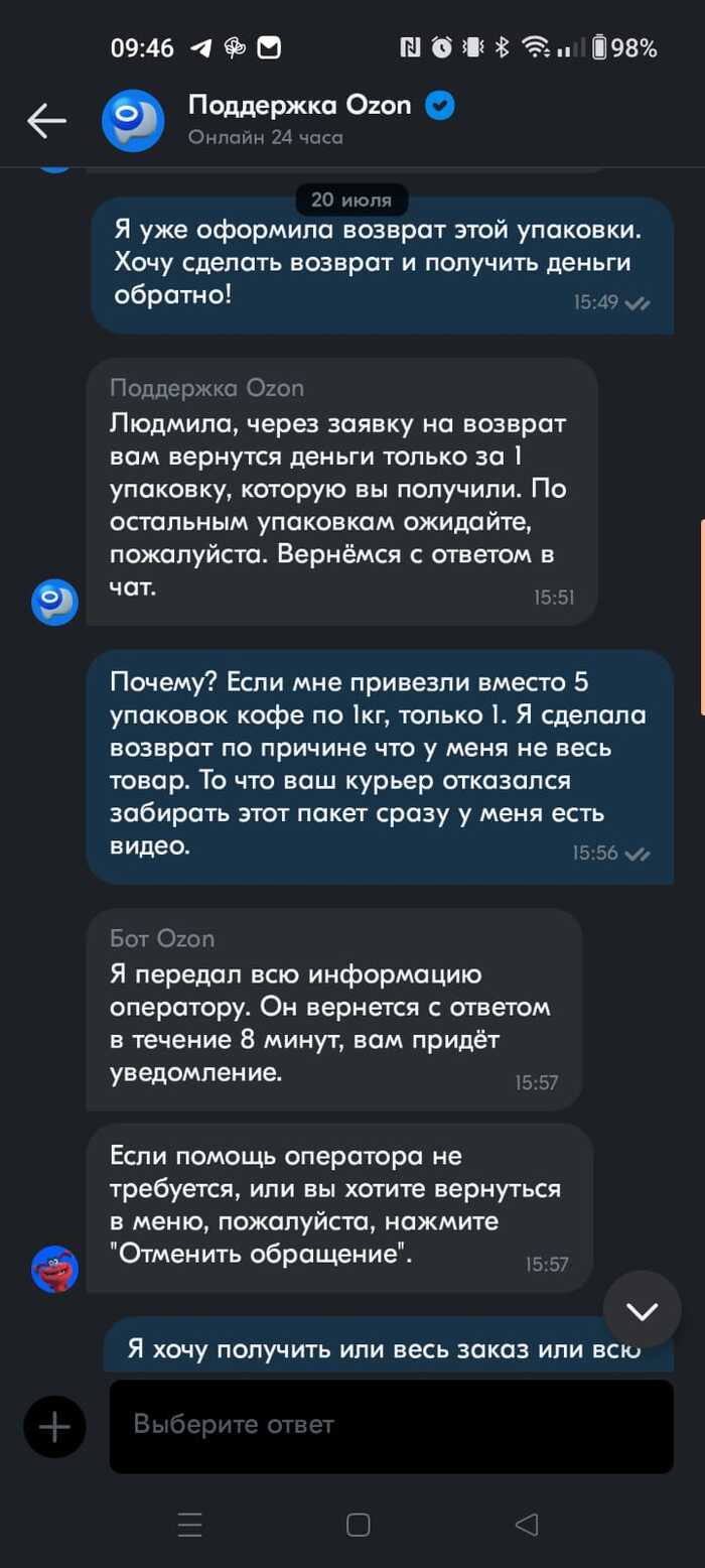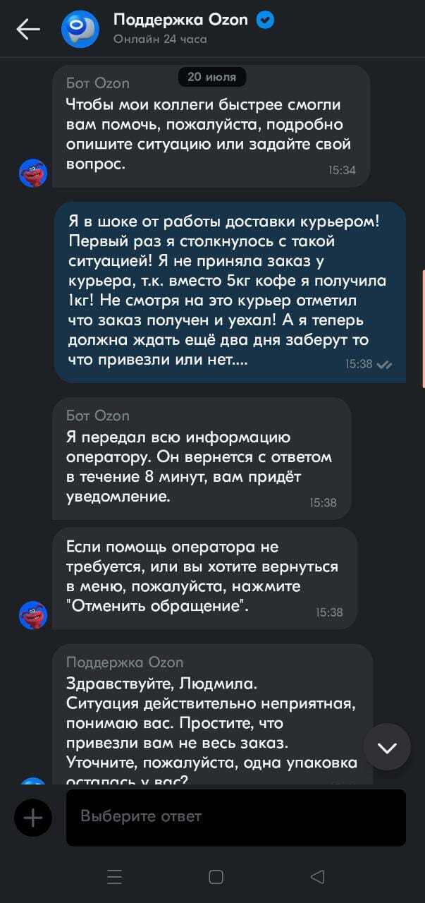 Мы пытались отказаться от заказа, но курьер просто уехал!!! По сути Озон тем самым нарушил наше право, как потребителя отказаться от заказа на любом этапе и ввёл в заблуждение по поводу того, что 1кг кофе это и есть наш заказ, который мы легко вернём, если он нас не устраивает. При этом взял деньги за весь заказ, а не за 1 пакет. Мне кажется или это попахивает мошенничеством?