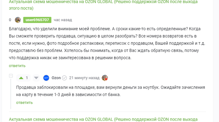 Теперь ждем поступление денег на карту. И да, вынужден признать, "Озон" все - таки не такое уж и днище, каким показался мне после отклонения первого спора по возврату без детального разбора ситуации. Сотрудники OZON среагировали, что самое интересное, после написания поста здесь. Вернут в итоге, но ведь можно было без этой всей возни обойтись, кучу нервов бы сэкономили своему постоянному покупателю.