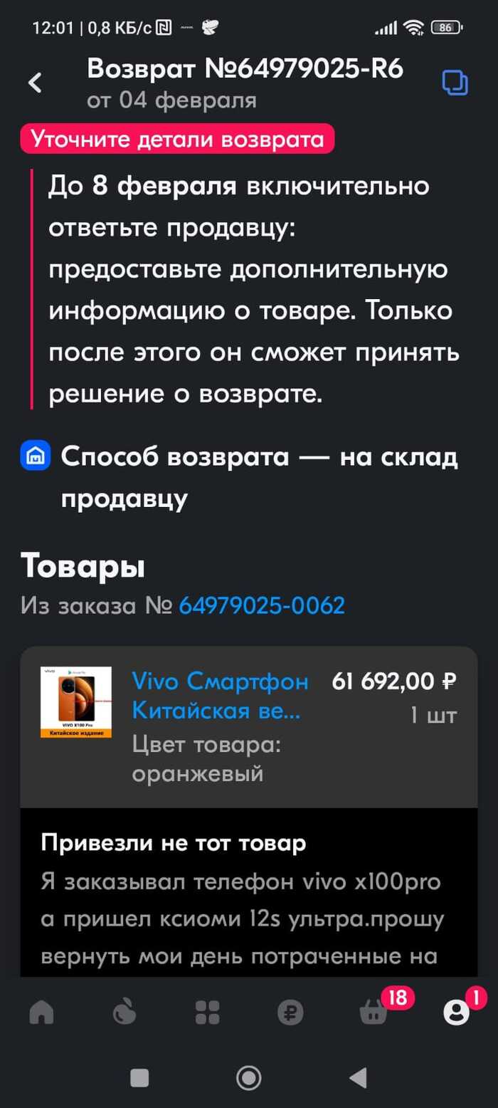 В соответствии с правилами «Озон Глобал» завел заявку на возврат и связался с продавцом. Продавец мне ответил, что посылку подменили на почте и в одностороннем порядке, без моего согласия якобы отправил замену, минуя доставку «Озон Глобал» с помощью транспортной компании (почты). При этом все мои просьбы согласовать возврат для отправки товара, не соответствующего описанию, обратно продавец проигнорировал. Также продавец проигнорировал просьбу ничего не отправлять (данная информация есть в чате с продавцом).