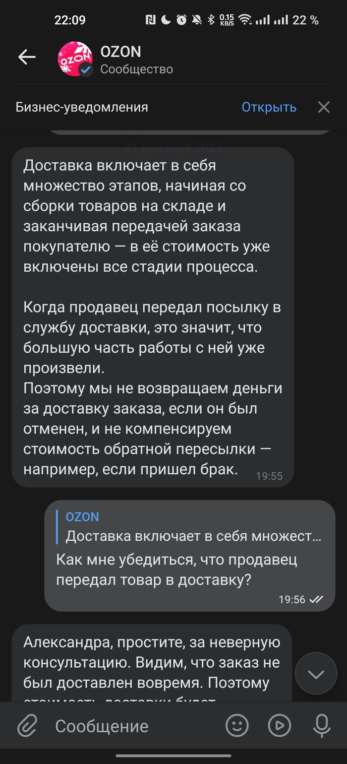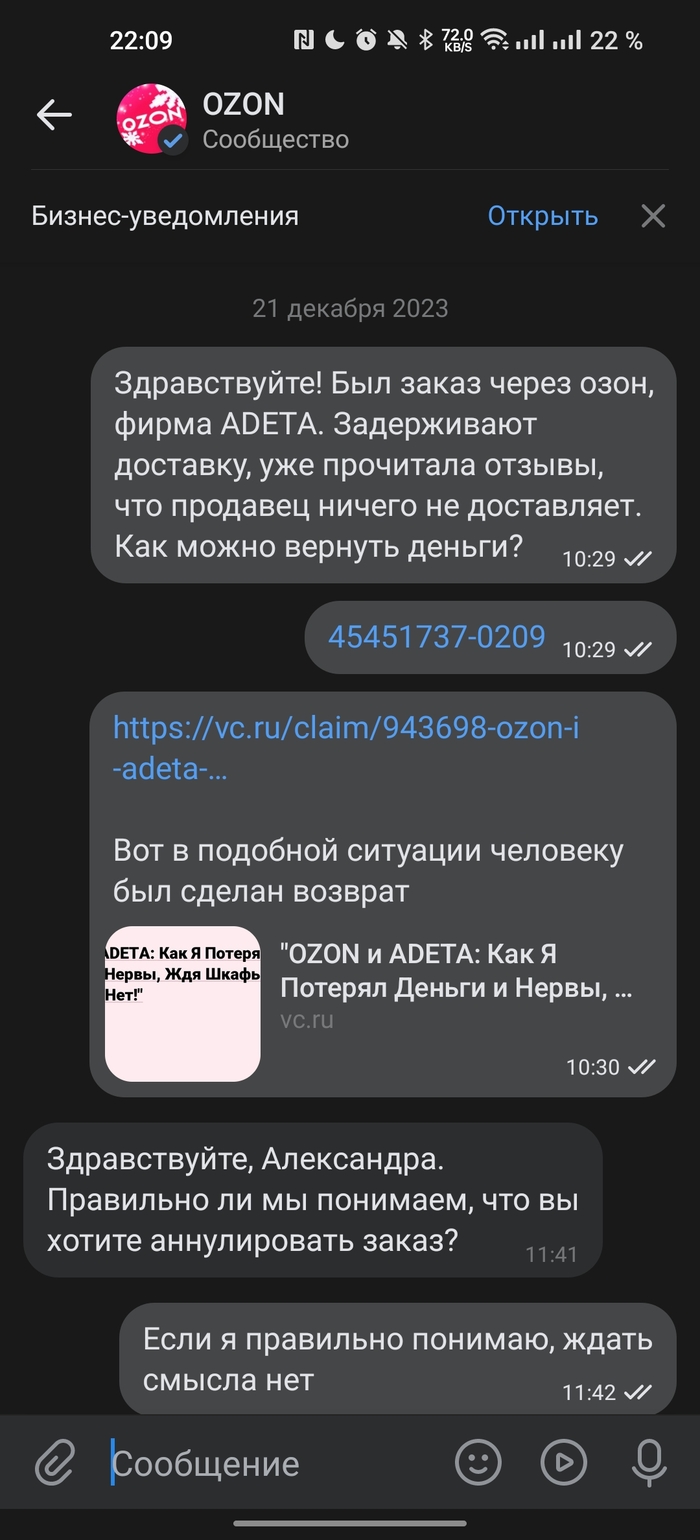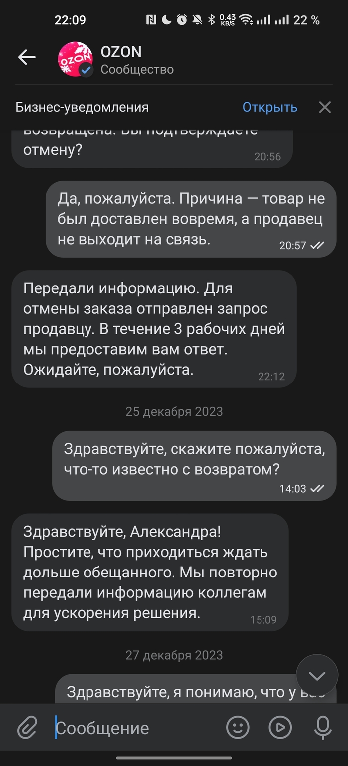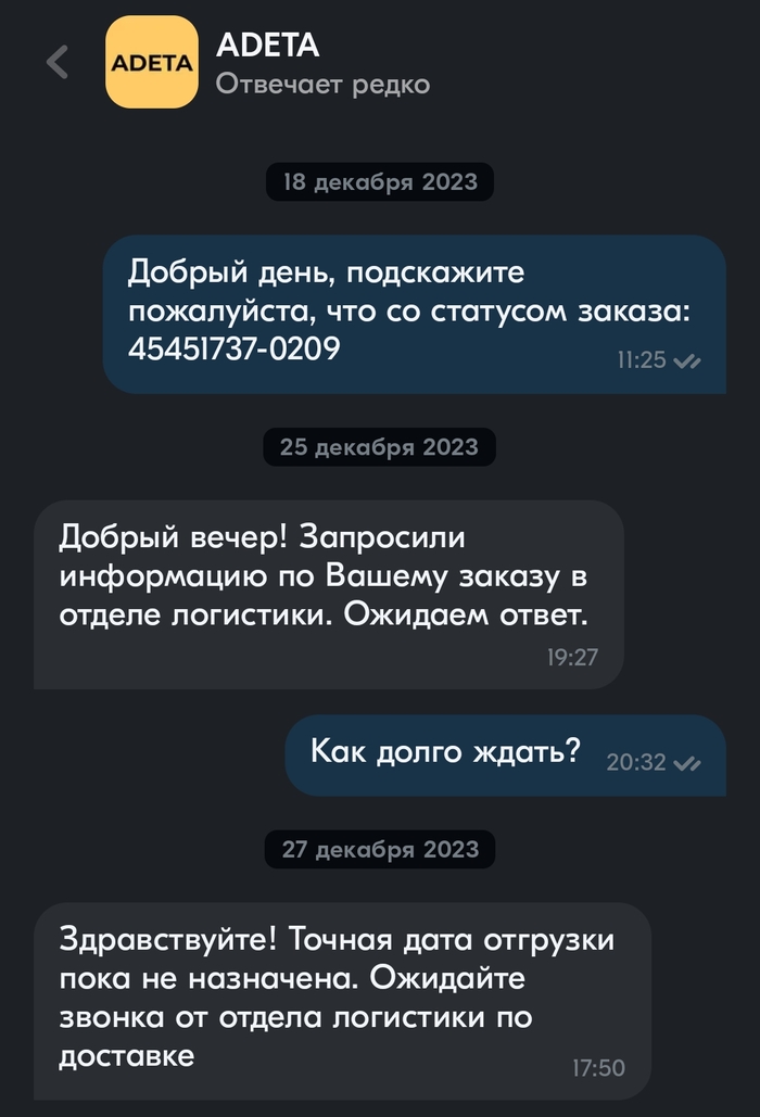 18 декабря статус сменился: "не успели доставить вовремя". Ок. Так бывает. Пишу продавцу. На работе предновогодний завал, поэтому на оповещения не обращаю внимания. Ответ от продавца пришел через неделю: "уточняем".