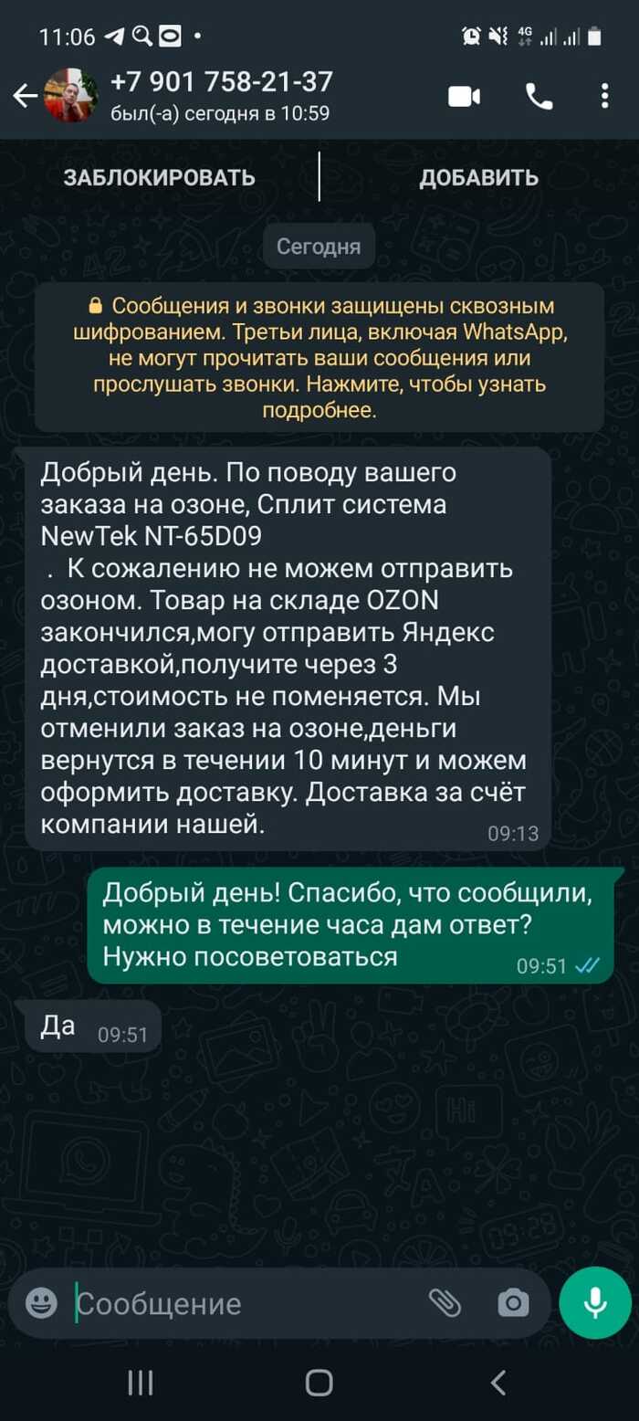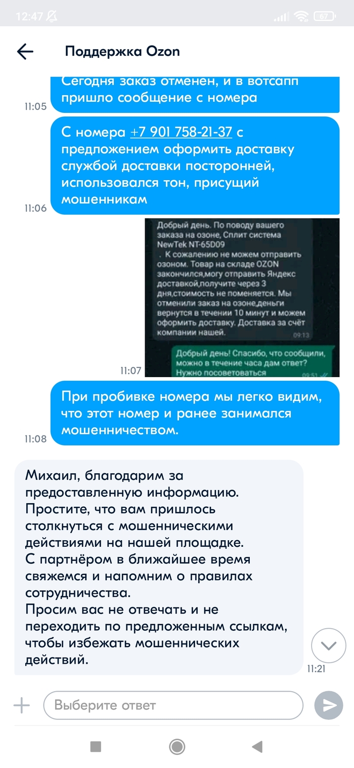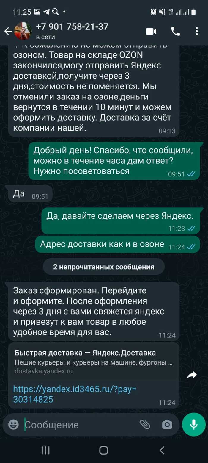 На следующий день заказ отменяется, деньги озон возвращает. Сразу после этого приходит сообщение на whatsapp от "продавца", в котором он говорит что с озоном у него не получается, но мне нужно перейти на фишинговый сайт с названием похожим на Яндекс, и тогда все будет прекрасно (у него, не у меня). Пробивка мобильного телефона, с которого пришли сообщения подтверждает мои догадки.