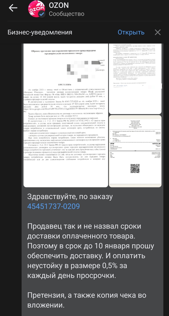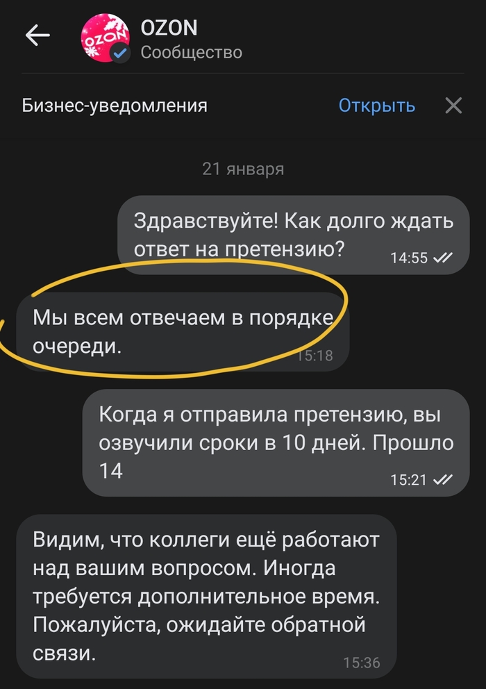 7 января написала претензию с требованием вернуть деньги за товар, доставку и неустойку за просроченную доставку. Озон взял 10 дней на ответ.