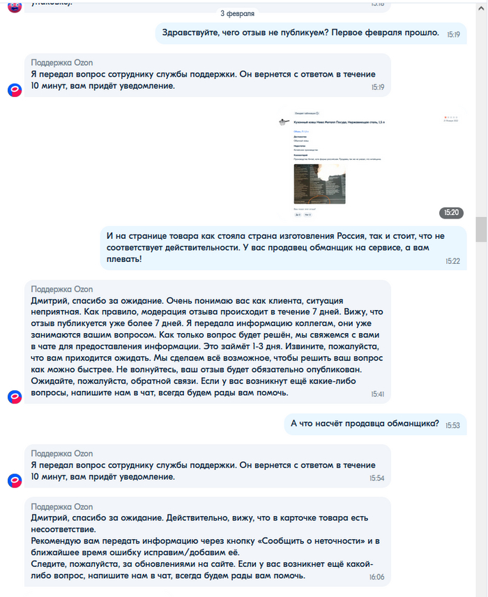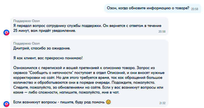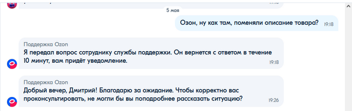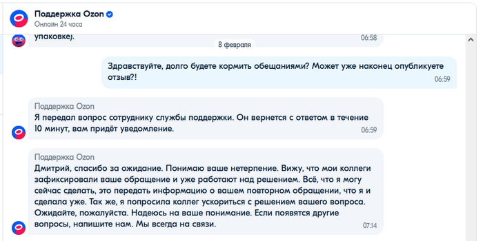 А сотрудник просто сваливает из чата и переключает обратно на бота. Супер, Озон, зови кожаных!