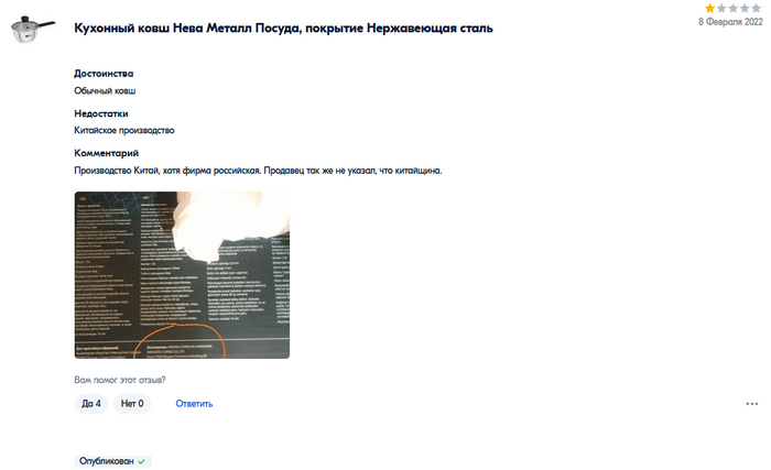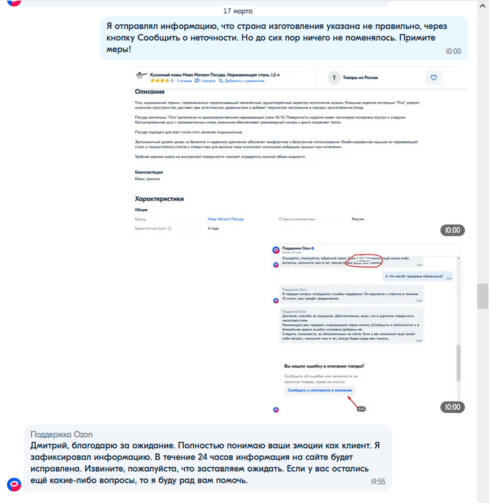 Через месяц опять решил что-то поискать на Озоне. Вспомнил про китайский ковш, проверил, не исправили. Я зол! Куплю нужное "что-то" в другом месте, в топку Озон. Интересуюсь, как там дела с исправлением информации в карточке товара: