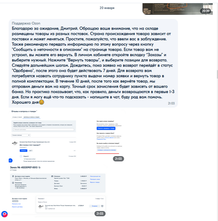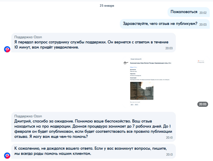 Такой наглый обман я терпеть не собирался и отнёс ковш обратно. Приняли без проблем, деньги вернули через некоторое время. А дальше я решил уберечь других покупателей от обмана и пошёл на сайт Озона. В планах было написать гневный отзыв, забыть и пойти искать другой ковш в другом месте. Но не тут то было...