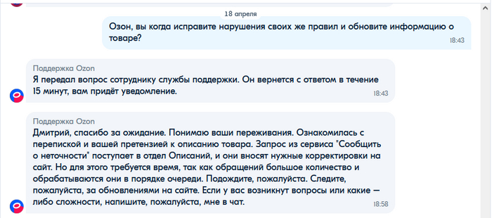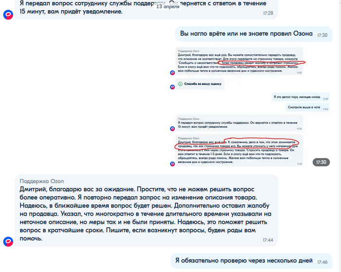 А Озон предлагает начать всё сначала — написать продавцу самостоятельно. Да я это давно давно сделал! У них там что поддержка совсем историю чата не читает?! Жесть... Иду читать правила для продавцов, предлагаю поддержке так же изучить этот вопрос: