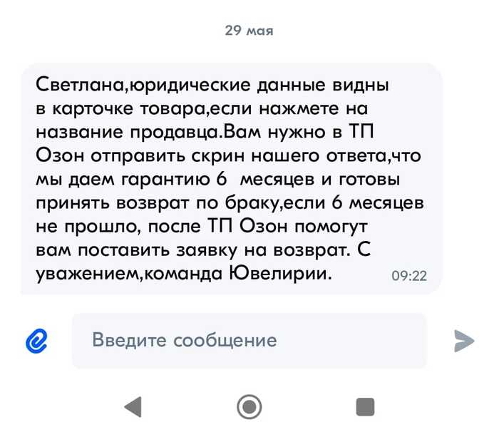 Связалась с продавцом, приложила все скрины и фото изделия с выпавшим камнем, продавец согласился принять возврат, так как по его словам «на все изделия идёт гарантия 6 месяцев». Но. Вот незадача! Озон не даёт оформить возврат, так прошло более 7 дней. Продавец тоже не соглашается на другую форму возврата. Через бота не могу прорваться!