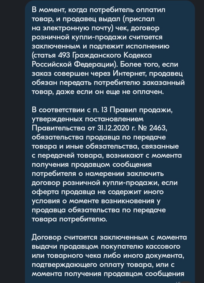 Но всё же, 24 января, когда заказ был оплачен, между мною и Озоном был заключён договор купли-продажи товара, и у продавца появилось обязательство передать товар.