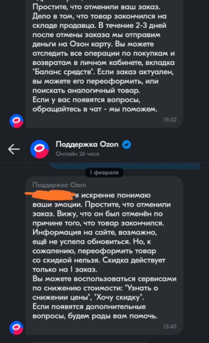 Ozon отменил заказ по акционной цене, а обычная цена в 10 раз больше. Служба поддержки Ozon врёт2