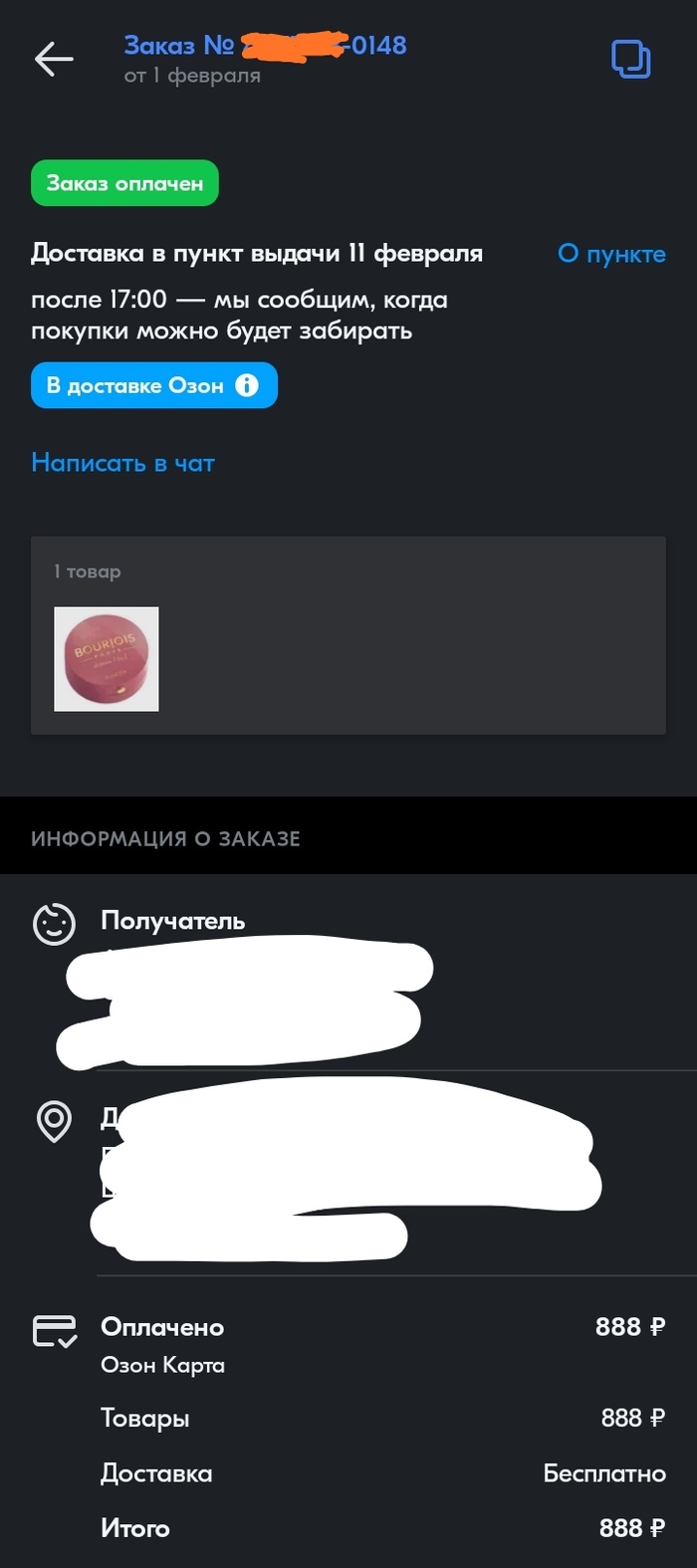 В общем, поставщик собирал-собирал заказ, иии... спустя неделю что-то пошло не так на этапе "передается в доставку Ozon" и 1 февраля заказ отменили.