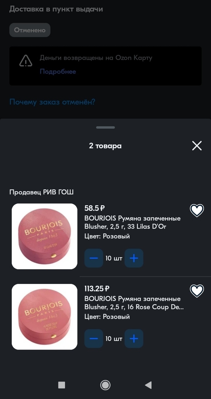 Сегодня смотрю - поставщик Рив Гош таки-передал в доставку Озон заново заказанные румяна за 888 рублей.