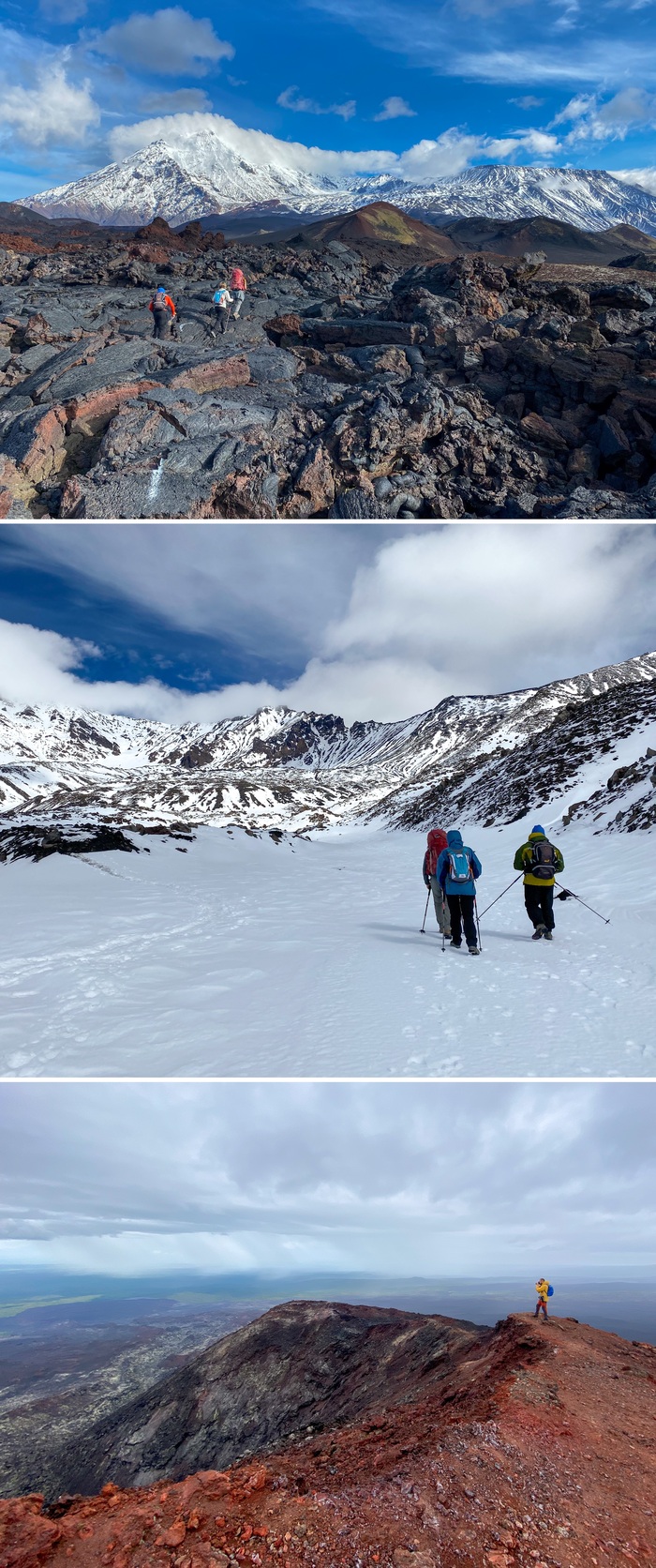 Сами подъемы на вулканы не особо длинные и достаточно простые в хорошую погоду. Вокруг отличные виды, чувствуются масштаб и мощь полуострова. Нам с погодой не повезло, было сурово, на восхождениях познакомились с горизонтальным дождем и шквальным ветром. Опыт интересный, но и эффектных фотографий не будет. На том же Горелом, дойдя и заглянув в кратер, увидели только белую пелену.