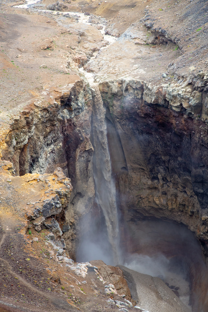 А вот водопад Опасный рядом с началом тропы на Мутновский вулкан не подвёл. Показал себя во всей красе с ниспадающим кофейным потоком на сотню метров. При этом ветер на смотровой по ощущениям был сильнее порывов Сулакского каньона в Дагестане. Может спокойно выдержать падающего человека.
