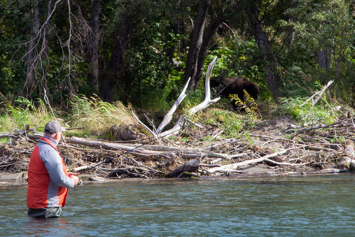 Чтобы гарантированно познакомится с косолапыми, нужно лететь или ехать на Курильское озеро. Там на кордонах оборудованы специальные площадки для наблюдения за животными, а смотрители возят туристов на лодках по озеру и рекам. Медведи есть всегда. У нас времени добраться туда не было, а опять брать вертолет слишком накладно, оставили идею на следующий визит. Поэтому в свободный (резервный) день заказали однодневный сплав по реке Быстрая. Решили испытать удачу и найти бурых мишек, о которых рассказывают местные турфирмы. В наш день особого медвежьего ажиотажа не было, на реке никто из них не стоял и не вылавливал лапой рыбу. Но под конец застали как медведица с медвежатами из кустов спугнула группу рыбаков.