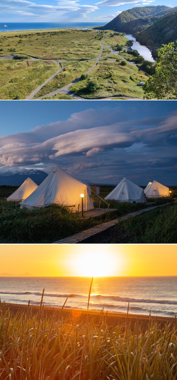 На пляж можно приехать и на несколько часов, но идеально с одной ночевкой (проводить закат, встретить рассвет). Мы как раз решили завершить наше путешествие на пляже и в последнюю ночь сменили квартиру в городе на побережье Тихого океана. Выбрали глэмпинг KAMRELAX. Уровень комфорта значительно выше обычной палатки, полноценная кровать и много места вокруг. Но туалет и душ отдельно, правда вполне удобные. Из приятных дополнений - баня на берегу, вкусная кухня и отдельный уютный шатер, где можно устроить прощальный ужин перед возвращением в Москву.