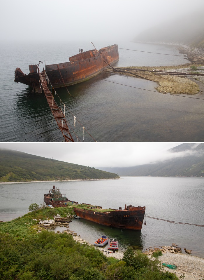 А сама бухта Русская вытянута и похожа на классический фьорд. В ней раньше прятались суда от непогоды, а во времена Второй мировой в бухте собирались караваны судов, следовавших из Америки во Владивосток с военным грузом. Потом бухта использовалась рыбацкими судами для пополнения запасов пресной воды и смены экипажей. А сейчас здесь два забытых корабля, к которым и причаливают туристические катера.