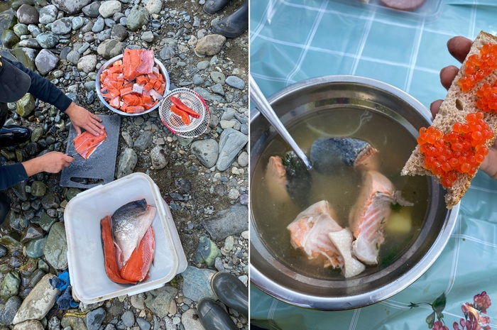 В остальном сплав на Камчатке – отдых для пенсионеров и рыбаков) Выдают высокие резиновые сапоги, угощают чаем и вперед. Порогов нет, идёшь медленно по течению и забрасываешь спиннинг. Потом на привале вам варят отличную уху, а из пойманной рыбы делают икру "пятиминутку" и сашими. После самого сплава завозят на Малкинские горячие источники с несколькими большими горячими "лужами" без особых удобств.