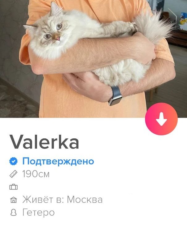 P.S. догадалась прогнать фотку через поиск, вышли его анкеты на майл.ру и на мамбе. Там он немного полнее, чем в тиндере (он писал, что похудел недавно, после зажористой пандемии). Описание то же, кот тот же, местонахождение - Россия, Литва, Нидерланды.