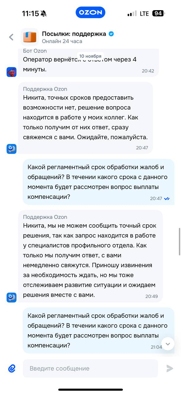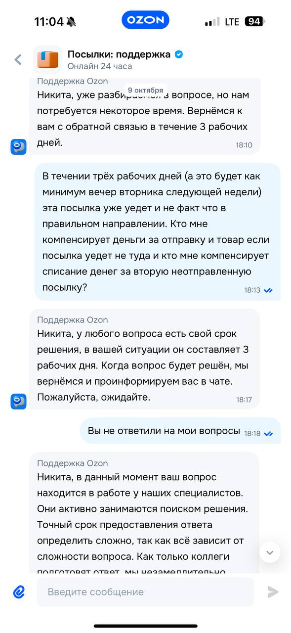 Посылка уехала не в тот город и через 3 дня разумеется никто ничего не порешал, как и через 5, 10, 15 и т.д. дней - уж не буду прикреплять абсолютно все скриншоты их шаблонных ответов каждые пару дней "коллегам нужно больше времени, мы не можем на них повлиять, и вообще по правилам срок доставки посылки до 30 дней"
