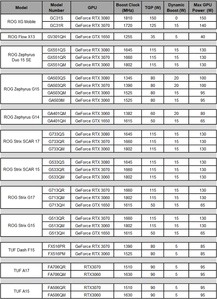 Вот к примеру таблица с некоторыми ноутбуками от Asus на видеокартах 30-ой серии и как мы можем заметить одна и та же на первый взгляд видеокарта по мощности может значительно отличаться. Например RTX 3060 в ROG Zephyrus G14 установлена мощностью 60 ватт, а в том же ROG Strix Scar 17 эта же 3060 уже обладает мощностью в 115 ватт, то есть TGP практически в два раза выше.