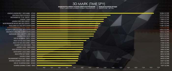 С ноутбуками всё несколько сложнее: помимо видеочипа, на производительность влияет и его теплопакет. NVIDIA использует для его обозначения параметр TGP, который указывает на потребление ресурсов видеокартой.