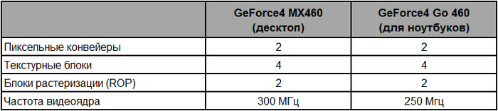 В итоге Nvidia решила снижать мощность мобильных видеокарт, чтобы сделать возможной их установку в ноутбуки. Чтобы пользователи лучше понимали, какая видеокарта устанавливается в ноутбук, мобильная графика обозначалась иначе, чем десктопная. Когда названия серий состояли из одной цифры, в названии мобильной графики появилось дополнительное слово «Go». Например, видеокарта NVIDIA GeForce 4 MX 460 предназначалась для компьютеров, а NVIDIA GeForce 4 Go 460 – для ноутбуков. Ранее снижение производительности и тепловыделения графики выражалось в понижении тактовых частот. Для сравнения возьмём всё ту же десктопную NVIDIA GeForce 4 MX460 и мобильную GeForce 4 Go 460. Строение видеоядра у двух видеокарт одинаковое: 2 пиксельных конвейера, 4 текстурных блока (TMU) и два блока растеризации (ROP). Изменились только частоты - десктопная GeForce 4 MX 460 работала с частотой 300 МГц, а мобильная GeForce4 Go 460 оказалась на 50 МГц медленнее.