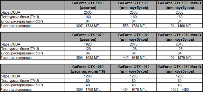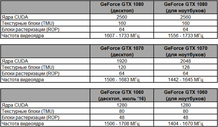 Разница в производительности десктопных и мобильных видеокарт сохранялась до 2016 года, пока NVIDIA не представила архитектуру Pascal и видеокарты GeForce GTX 10-й серии. На этом этапе NVIDIA смогла свести к минимуму разницу между десктопными и мобильными GPU. Для обозначения мобильных видеокарт больше не требовались дополнительная буква, индекс или слово. У NVIDIA GeForce GTX 1080 и GTX 1060, созданных для ноутбуков и компьютеров, стало одинаковое количество ядер CUDA. Даже у мобильной GeForce GTX 1070 оказалось чуть больше CUDA-ядер по сравнению с её десктопным аналогом. Разумеется, частоты у мобильных и десктопных видеокарт немного различались, но разрыв между мобильной и «полноценной» десктопной графикой в рамках одного поколения стал не настолько большим и заметным, как это было ранее. А в зависимости от эффективности системы охлаждения, разницы могло и вовсе не быть.