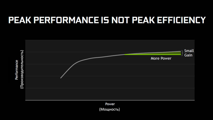 Необходимо пояснить, что не стоит путать понятия «энергоэффективность» и «производительность». В первом случае графика работает с максимальной производительностью относительно потребляемой мощности, и не выходит за пределы заложенного лимита энергопотребления. Во втором случае происходит прирост производительности, за который приходится расплачиваться увеличивающимся тепловыделением и энергопотреблением.