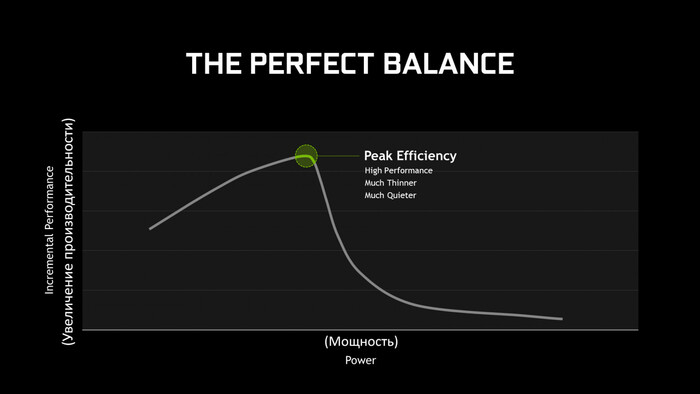 Зависимость между потребляемой мощностью и ростом производительности нелинейная. При увеличении потребляемой мощности прирост производительности сперва будет заметным, линейным, а потом, после прохождения точки максимальной эффективности, прирост производительности (который не стоит путать с самой производительностью) замедляется. Проще говоря, видеокарта Nvidia GeForce GTX 1080 будет быстрее GTX 1080 Max-Q, но при этом потребует улучшенной системы охлаждения и станет потреблять больше энергии.