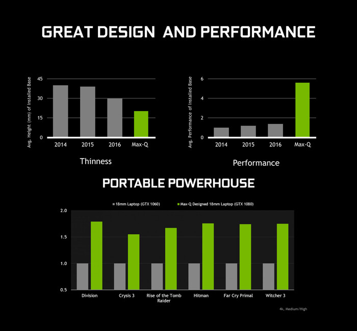 В результате в 2017 году на рынке появилось два типа ноутбуков: с классической графикой GTX 10-й серии и с графикой Max-Q. Появление линейки Max-Q позволило выпускать тонкие и лёгкие игровые модели, чего не удавалось добиться ранее. Для Max-Q не требуется крупногабаритная система охлаждения.