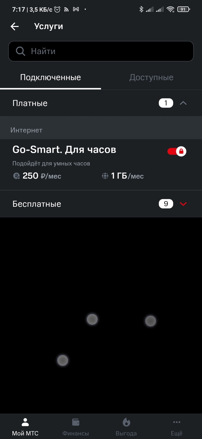 Минут через 15 заходим в приложение ( вот не знаю зачем я туда ещё раз полез) и видим картину, у нас подключена услуга "go- smart для часов" за 250р в месяц ( а это 300 минут и 1 ГБ интернета(нахрена на часах столько не понятно. У меня 500МБ не заканчивались за месяц)