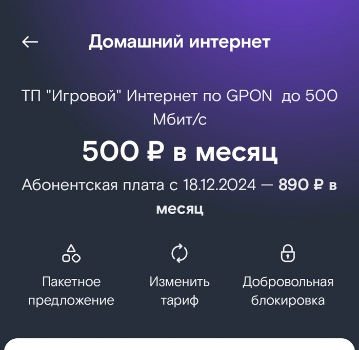 Снова зайдя в приложение через некоторое время, я увидел, что у меня стоит тариф "Игровой", а должен я не 890 рублей за него, а 500.