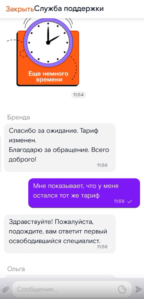 О - я уточнила. Точно произошла ошибка, сейчас я составлю претензию и мы вам вернем ваш старый тариф. Я - хорошо О - Подождите ещё пару минут, я составлю претензию. Я - хорошо.
