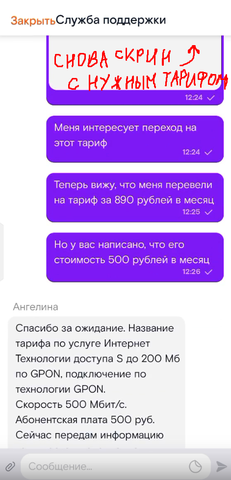 Ни одна из них мне не подходит, о чём я и сообщаю, приложив скриншот с тем тарифом, который они сами мне предлагают в личном кабинете, и который меня заинтересовал.