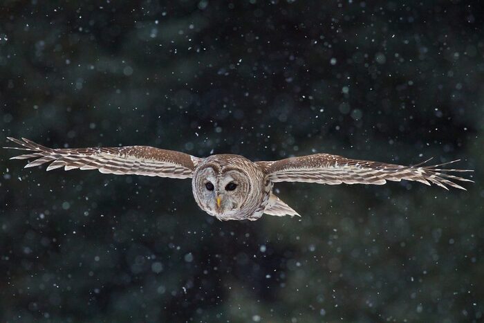 Пёстрая неясыть (Strix varia) - ночной хищник, который сильнее, чем кажется. Эти птицы весят менее 1 кг, но если чувствуют опасность, то могут атаковать, как не снилось даже самым сильным собакам. В Америке эти хищные совы бросаются вниз с деревьев и царапают головы и лица своими острыми когтями ничего не подозревающим туристам. Известно также, что они нападают на домашних животных, например, на кошек.