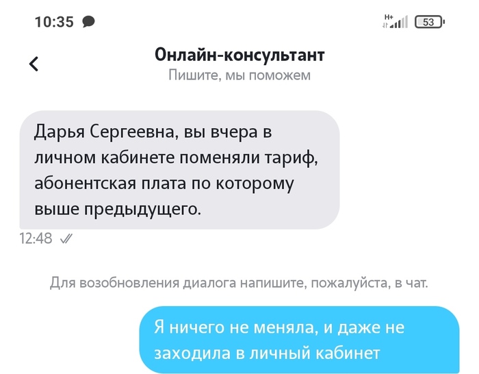 Да, да, вот только в тот день и час телефон я в руки не брала, и этому есть свидетели. Да и, вроде как, человек в здравом уме не будет переходить на менее выгодный для себя тариф.